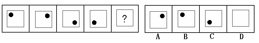 (答案:B。黑點在正方形中順時針移動。在第5個圖形中,應該正好移動到左上角。)